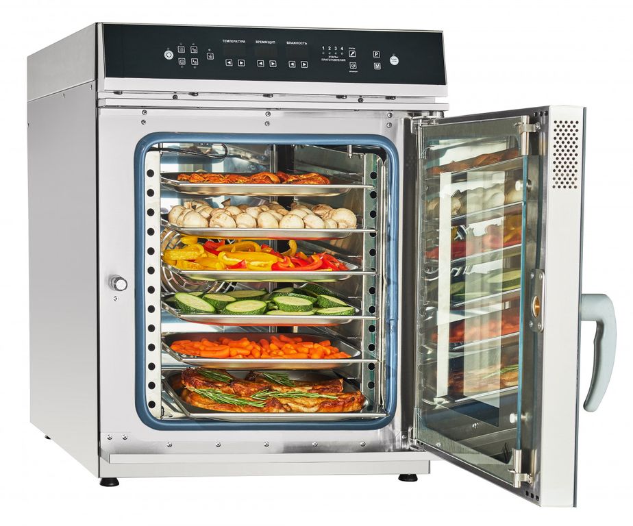 - бойлерный тип (встроенный парогенератор) - удобная панель управления на русском языке (мембранная клавиатура) - легкость в обслуживании - ТЭН парогенератора легко очищается от накипи - вентилируемая дверца с двойным термостойким остеклением предотвращает риск получения ожога с внешней стороны двери - двухходовый механизм открывания дверцы духовки обеспечивает безопасность персонала от воздействия горячего пара - система закрывания двери "свободные руки" - дверь легко можно закрыть одним движением руки - лоток для сбора конденсата предотвращает стекание капель воды на пол при открытии двери - камера с закругленными внутренними углами для удобства эксплуатации и обслуживания - внутренняя подсветка камеры - степень защиты камеры от проникновения влаги соответствует стандарту IPX5 (конструкция духовки позволяет мыть ее изнутри под струей воды) - высокоточный температурный щуп можно использовать со всеми базовыми программами для увеличения эффективности приготовления - таймер от 1 минуты до 9 часов 59 минут - реверсивный вентилятор, 1 скорость - возможность записи до 110 собственных программ приготовления - до 4 этапов приготовления в каждой программе - низкое энергопотребление (5,2 кВт) снижает эксплуатационные расходы на приготовление блюд - автоматика обеспечивает быстрый выход пароконвектомата на рабочий режим - пароконвектомат подключается к ОДНОФАЗНОЙ сети напряжением 230 В РЕЖИМЫ: - конвекция (+30°С...+270° С) - конвекция + пар (+30°С...+250° С) - разогрев с паром (+30°С...+160° С) - низкотемпературный пар (+30°С...+98° С) - пар (+100° С) Пароконвектомат следует разместить в хорошо проветриваемом помещении. Во избежание накопления пара в помещении пароконвектомат рекомендуется размещать под воздухоочистительным (вытяжным) зонтом или использовать зонт ЗВВ-750П (код для заказа 21000003336). |
