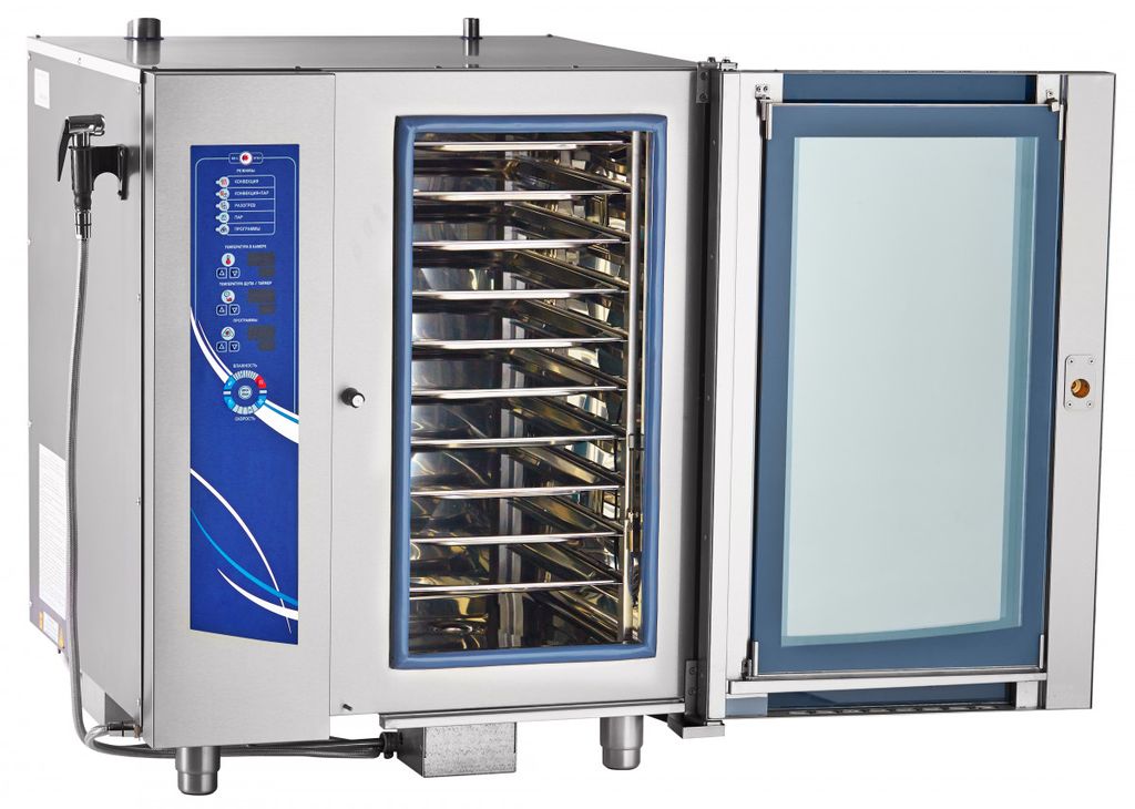 - бойлерный тип (встроенный парогенератор) - 10 уровней направляющих под гастроемкости типа GN 1/1 - продольная загрузка позволяет использовать гастроемкости как размера GN1/2, так и размера GN1/3 - удобная панель управления на русском языке (мембранная клавиатура) - легкость в обслуживании - автоматика обеспечивает быстрый выход пароконвектомата на рабочий режим - вентилируемая дверца с двойным термостойким остеклением предотвращает риск получения ожога рук с внешней стороны дверки - открывающееся внутреннее стекло дверцы позволяет полностью мыть стекла двери с двух сторон и предотвращает образование конденсата при приготовлении - двухходовый механизм открывания двери обеспечивает безопасность персонала от воздействия горячего пара - механизм замка двери действует по принципу "свободные руки" - дверку можно закрывать одним движением руки - внутренняя подсветка камеры - степень защиты камеры от проникновения влаги соответствует стандарту IPX5 - камеру можно мыть изнутри под струей воды - многоточечный температурный щуп можно использовать со всеми базовыми программами для увеличения эффективности приготовления - регулировка влажности от 0% до 100% - таймер от 1 минуты до 9 часов 59 минут - реверс вентилятора - 5 скоростей вращения вентилятора - можно легко подобрать необходимую скорость как для жарки мяса, так и для приготовления деликатных блюд - возможность записи до 110 собственных программ приготовления - до 4 этапов приготовления в каждой программе - ручной душ - встроенный лоток для сбора конденсата предотвращает стекание капель воды на пол при открытии двери - система охлаждения слива - 6 режимов автоматической мойки с возможностью применения как жидких моющих средств, так и твердых, в виде таблеток - низкое энергопотребление (по сравнению с аналогами) снижает эксплуатационные расходы на приготовление блюд - широкий ассортимент дополнительных аксессуаров |