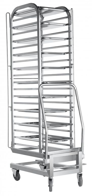 Тележка передвижная ТП-20-1/1 является вспомогательным оборудованием, вмещает 20 гастроемкостей, размером GN 1/1, и используется для их транспортировки и установки в 20-ти уровневом пароконвектомате ПКА-20-1/1 ПП. Имеет съемную ручку для транспортировк